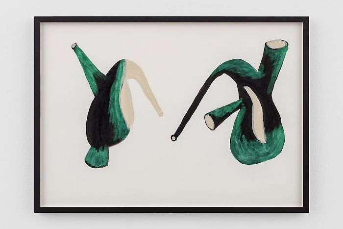 Camila Sposatis Serie "Phonosophia" ist eine fesselnde Erkundung der Symbiose zwischen den Grundelementen des Anatomischen Theaters der Erde - Schwerkraft, Ohr- und Stimmdynamik und theatralische Instrumentierung. Im Rahmen dieses multidisziplinären Projekts entstehen Zeichnungen als eloquente Ausdrucksformen, von denen jede eine nuancierte Verbindung zur komplizierten Welt der Toninstrumente offenbart. Eine Zeichnung, fast ätherisch weiß, fängt die Essenz des Toninstruments in einem mimetischen Tanz ein. In starkem Kontrast dazu entfaltet eine andere Zeichnung innerhalb der Serie eine lebendige Erzählung. Zwei grüne Objekte, die die Instrumente widerspiegeln, stehen verwegen vor einem kontrastreichen Hintergrund. Der grüne Farbton, eine bewusste Abkehr von dem fast himmlischen Weiß, verleiht der Komposition eine lebendige Energie.