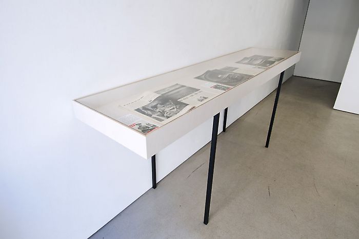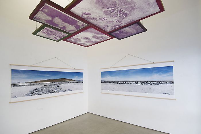Darüber schweben fünf Siebdrucksiebe mit Motiven von Zieleinrichtungen der US Army in den Sperrgebieten UTTR, die sich in örtlicher Nähe zum Salzsee in Utah befinden. In einer eleganten Vitrine werden zudem drei Life Magazine aus den Jahren zwischen 1945 und 1952 präsentiert, die eindrucksvoll belegen, in wieweit die zunächst geheimen Atombombenversuche Eingang in die amerikanische Populärkultur gefunden haben, um damit die militärische Stärke und Überlegenheit der amerikanischen Supermacht in der Zeit des Kalten Krieges massenmedial zu verbreiten. Die Wüste wurde gleichsam als Atomlabor stilisiert. Die amerikanischen Land Art Künstler verwendeten also keineswegs “unangetastete” Urlandschaften als ihre identitätsstiftenden Bühnen, vielmehr waren diese im Zuge der Atomwaffentests schon längst in den Massenmedien zur “Atomic Desert” mutiert. Herwig Turks Installation kann als Reflexion der in Massemedien verbreiteten Berichterstattung gelesen werden, die von immenser politischer, ökonomischer und ökologischer Bedeutung waren. Darüber macht Turk deutlich, dass selbst wissenschaftliche Geschichtsschreibung nach subjektiven, ideologischen Richtlinien interpretiert wird, stetigen Veränderungen unterworfen ist und sich stets neu konstruiert.