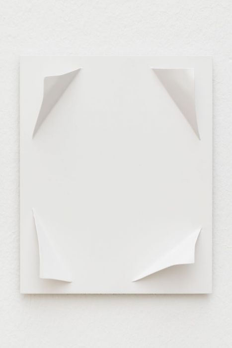 Die Serie Dorso besteht aus einer Reihe von Variationen auf lackierten Eisenblechen, die auf Papierfaltungen basieren und eine lose Annäherung an die Rückseiten von Museumskarten darstellen. Sie bilden "Rhythmen" mit zarten, erhabenen Volumina, die Licht und Schatten auf der monotonen weißen Oberfläche streuen. Durch die Spannung und die Schlaffheit der einzelnen Faltungen erhält jede Skulptur einen anderen Charakter, der eine Zerbrechlichkeit und Organik vortäuscht, die in Wirklichkeit hart und schneidend ist. In den Collagen wechselt sich Synthese mit dem Zittern des von Hand zerrissenen Papiers ab, wo minimale Elemente wie Punkte und Linien auftauchen, zusammenstoßen oder in Kompositionen ruhen, die sowohl schwerelos als auch dynamisch sind und durch die Refrains bestimmter Erinnerungen, Bilder oder Ideen entstehen. Die Gemälde Lipsanotecas I und Ascensor II, die aus gewohnten Begegnungen gewonnen und in unterbewusste Landschaften übersetzt wurden - Abenddämmerung, die Überreste in einer Schachtel, eine Busfahrt - erforschen die sensorischen Bedingungen einer solchen Erfahrung durch die Vibrationen, die in der Materie auftreten, und die Verschiebungen im Tonwertverlauf. Die auffallend schweren, zähflüssigen, mit dem Spachtel aufgetragenen Ölfarben bieten eine taktile Intensität zu den monochromen Arbeiten und den subtil flüchtigen Oberflächen der Collagen.