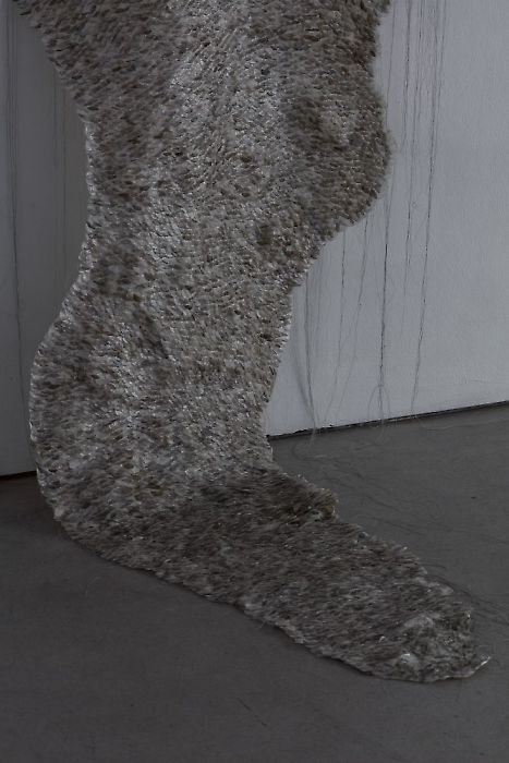 Über die Grammatik des Titels von Coelns Ausstellung führt uns die Figur des Finn auf eine semantische Reise zu „fin“, wie in „Ende“, Beendigung, Verneinung von Leben, Tod und der Totenwache, die ihm folgt. Von dieser negativen Konnotation geht es zurück zur deutschen „Flosse“ (engl.: fin): die Flosse, der es G.S. inmitten von Gesten zur Orientierungslosigkeit und richtungslosem Dahintreiben mangelt. „Flosse“ schwingt auch im „Fluss“ mit, abgeleitet von „fließen“. Wenn ein Fluss einen Zeitstrang in den Lauf seiner Fluten wirft, strömt er, wogt und tobt. Man sagt, dass ein Strom am Anfang und am Ende derselbe ist, nur dass er irgendwann ins Meer hinaustreibt. Ein Gedicht von Bertolt Brecht[2] spricht von der gewalttätigen Einengung, die ein Fluss durch das Flussbett erfährt. Hier wird G.S. verankert, gehängt, drapiert. Es könnte uns kleiden. Es erinnert uns an unsere Körperlichkeit, unseren Atem.