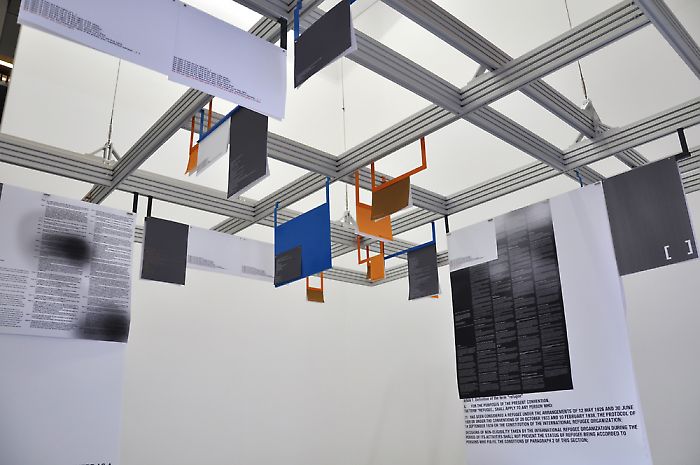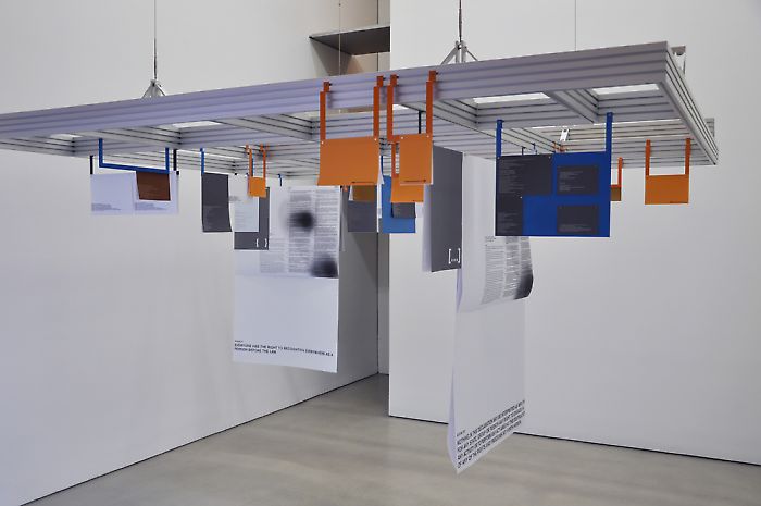 Im rechtlichen Format des Ausnahmezustandes, vorgesehen als ein begrenzter Zeitraum in Krisensituationen, findet die politische Praxis der Suspendierung von Grundrechten ihren intensivsten Augenblick. Denn der, der über die legale Macht verfügt, die Geltung des Rechts aufzuheben (beispielsweise den Ausnahmezustand auszurufen), also Recht zu suspendieren, setzt sich damit ebenso ausserhalb des Rechts. Souveräne Macht steht daher ausserhalb und innerhalb des Rechts. In dieser Installation wird versucht, den verschiedenen Widersprüchen und Paradoxien der Menschenrechte eine Form zu geben. Dabei ist die politische Macht der Souveränität in dieser Arbeit nicht präsent. Sie bleibt nicht genannt, sie ist nicht unmittelbar abgebildet, sie ist nicht direkt repräsentiert. Als abwesend agierende Bedrohung bleibt sie jedoch vollkommen real.
