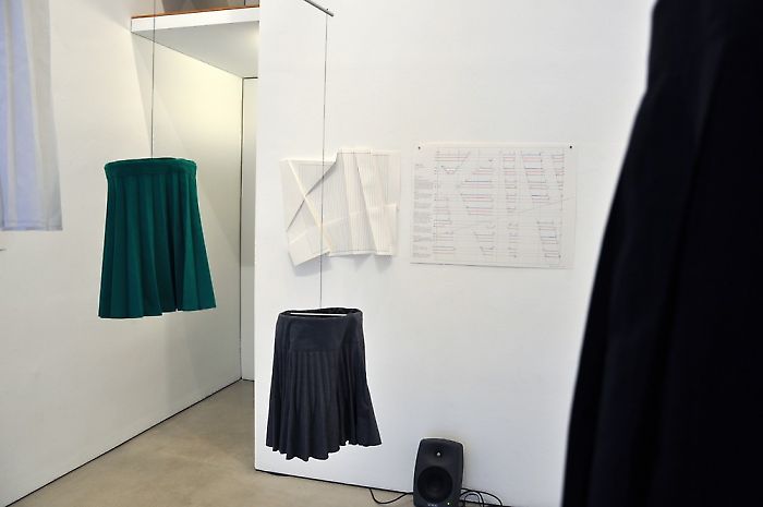 Solche Partituren und ihre musikalische Interpretation bilden zwei Teile der Installation mit dem Titel Faltenrock in der Georg Kargl Box. Als Ausgangsbasis verwendet der Klangkünstler Engelen elf unterschiedliche Faltenröcke, die er zu einem Mobile arrangiert. Die kulturgeschichtliche Assoziation des traditionellen Beinkleids mit Musik und Tanz setzt Engelen zum einen um, indem er die Röcke im Raum frei schwebend „tanzen“ lässt. Zum anderen dienen die Falten der Röcke als Muster für seine Partituren. Unbeschriebene Notenblätter knickt William Engelen im Stil der unterschiedlichen Faltungen der Röcke. Erst dann beginnt er sie zu beschreiben. Nachdem die Partitur fertig ist, faltet er sie wieder auf und es entsteht eine Art Relief mit Leerstellen in den Knicken, wo die Falten waren. Diese Leerstellen werden von den Musikern mit Stille übersetzt, dadurch entsteht ein Klangmuster nach den Faltungen der Röcke. „Der Künstler faltet in dieser Komposition Zeit. Die Räumlichkeit der Partitur bestimmt die Räumlichkeit des Klanges. Klang, Raum und Zeit sind während der Umsetzung durch die Musiker eng verbunden.“[2] Und weil bei William Engelen alles mit allem in Beziehung steht wird die Partitur zum Faltenrock-Mobile durch ein Akkordeon, dessen Resonanzkörper gefaltet ist, und durch eine E-Gitarre, auch Rock-Gitarre genannt, interpretiert.