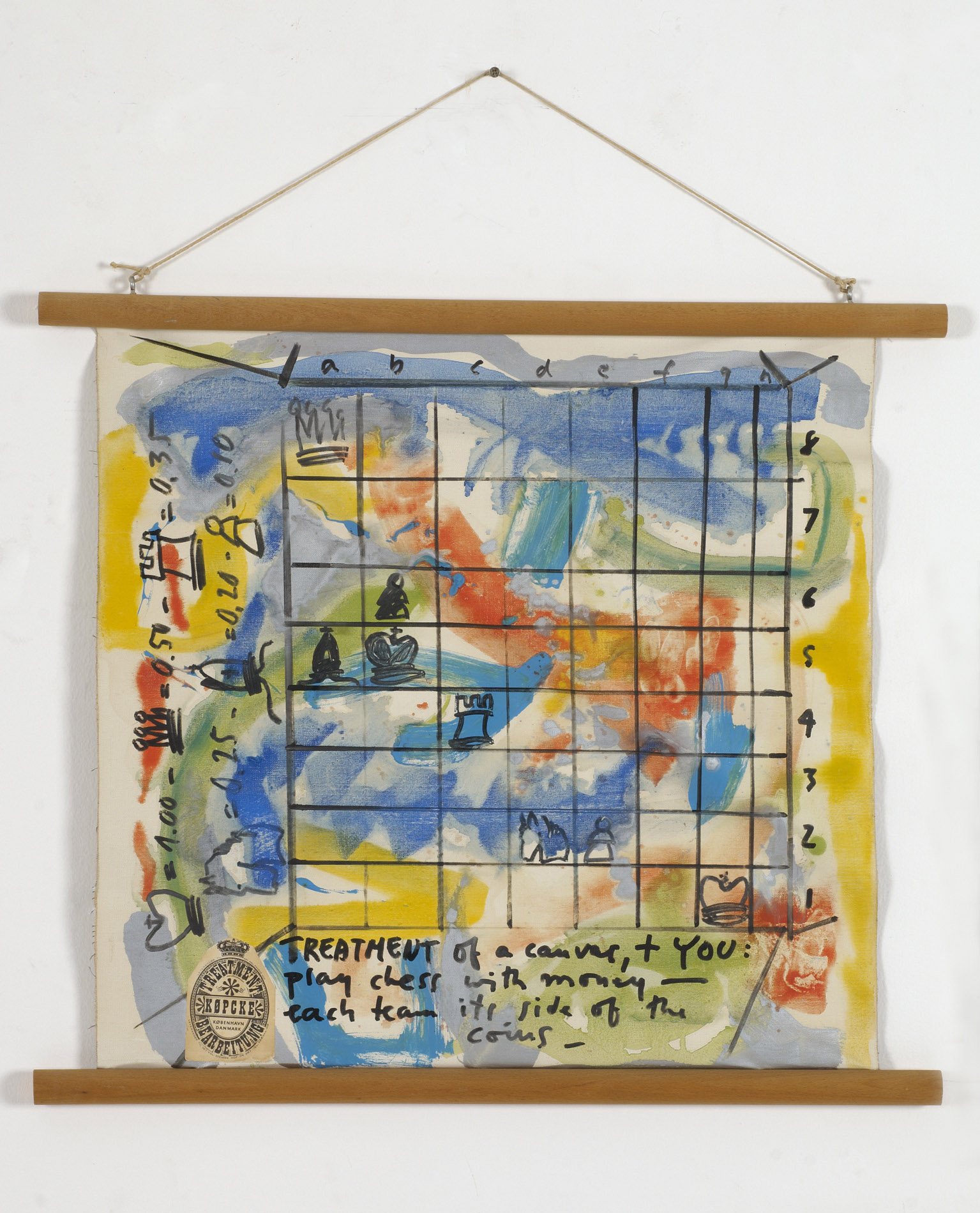 Arthur Köpcke, Treatment of a canvas, + You: Play chess with money - each time its side of the coins, 1965 |