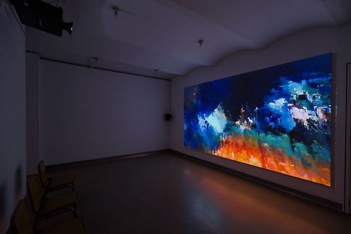 Beide Künstler, auf ihre eigene Art und Weise, heben diesen Mammut und schleudern ihn uns zu - sei es nun auf einer Leinwand oder auf einem Bildschirm. Ihre Werke beinhalten mehr als nur ein visuelles Erlebnis: Samiees Bilder sind Darstellungen des Geistes, umrahmte Rahmen. Wir sehen mehr als nur Farbe: wir sehen Tanz, wir sehen Worte, wir sehen Nachbilder die einer dunklen Materie entspringen, die sie - von innen - auf unseren Geist projektiert.