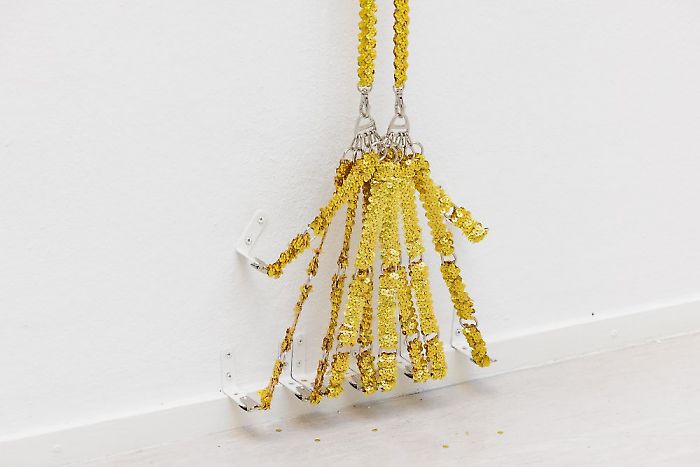 Der andere künstlerische Beitrag von Zhu Hug O’ Clock (2023) besteht aus sieben elastischen Hosenträgern, die in der Mode normalerweise zum Halten von Hosen verwendet werden. Die Serie ist inspiriert von den mechanischen Anzeigen für Stunden, Minuten und Sekunden, die als Arme einer Uhr bezeichnet werden. Zhu verlängert die Stunden- und Minutenzeiger auf die gleiche Länge und formt sie wie menschliche Arme, die sich förmlich an die Wände klammern, sie umarmen oder sich an ihnen festhalten. Innerhalb des Konzept der Ausstellung, das den Begriff des Zitats verwendet, könnten diese Elemente auch als sprachliche Zeichen, ähnlich wie Anführungszeichen, interpretiert werden, die strategisch in der Ausstellung platziert sind, um verschiedene Kunstwerke und künstlerische Standpunkte zu rahmen. Dieser Idee folgend werden die Beschreibungen von Zhu's Werken in Form von Zitaten präsentiert, die seine eigene Stimme widerspiegeln. Eine weitere Facette dieser Arbeit steht im Einklang mit Kerngedanken von Comizi d'Amore, der aus dem künstlerischen Bestreben resultiert, die Zeit zu manipulieren. Sie spiegelt damit die kuratorische Absicht wider, der Zeit habhaft zu werden und sie als ein Art Material zu begreifen.
