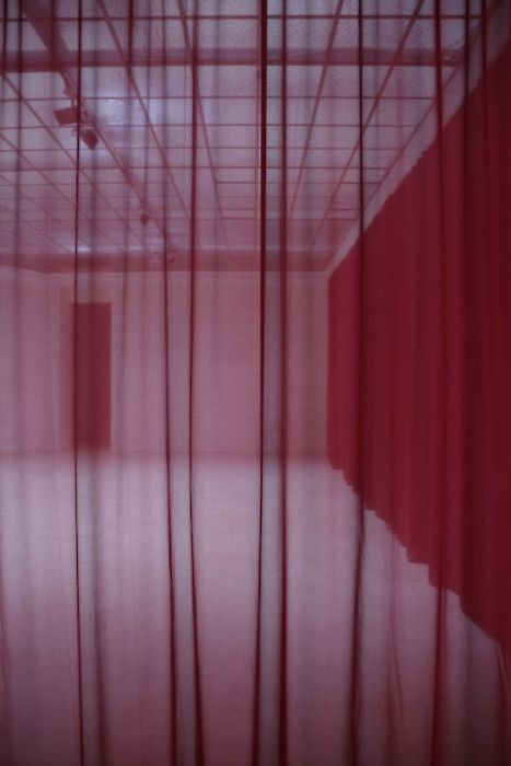 Der erste Unterraum der Galerie wird durch zwei Raumquader definiert, die ineinander gestülpt sind und Fragen nach dem Innen und Außen von körperlichen Befindlichkeitsebenen stellen. Im Sinne einer endodermen und ektodermen, d.h. nach innen oder nach außen gestülpten Hautkrümmung erneuert Rockenschaub den Blickwinkel auf die räumlichen Achsen der Kunstwerke sowie ihrer Definitionsmacht hinsichtlich der auratischen Zuschreibungen innerer und äußerer Strukturen. Letztere werden durch die Farbabstufungen der Quader in Verkehrspurpur und Ultramarinblau erzielt, die in ihrer ästhetischen Wirkung das Raumgefüge dekonstruktivistisch aufzubrechen vermögen. Eine Verschiebung der Dimensionen von traditionellen Wahrnehmungsszenarien eröffnet sich auch im Hauptraum der Galerie, der von einem rosafarbenen Vorhang an den Eingangseckwänden verschlossen wird. Hier kommt Rockenschaubs minimalistisches Formenvokabular zu tragen, das den spezifischen Umgang des Künstlers mit Räumen als farbige Projektionsfolien für mentale Prozesse verstärkt. Die Leere des Umraums definiert den Wirkungsgrad der künstlerischen Versatzstücke, die eine Redefinition auratischer Raumverhältnisse einfordert und Besucherinnen vorerst eng an den Vorhängen entlanggehen lässt um schließlich den Raum als Resultat eines modernistischminimalistischen Denkprozesses in seiner Gesamtheit zu erfahren.