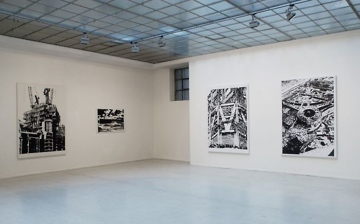 Herwig Kempinger hat jahrelang mit der Sehmaschine Kamera und der Wunschmaschine Computer in ausgeklügelten apparativen Verfahren gearbeitet und kehrt mit den neueren Baustellen-Arbeiten zu den ursprünglichsten aller denkbaren künstlerischen Methoden zurück: zu Pinsel und Farbe. Baustellen sind für Kempinger die größten temporären Inszenierungen, die es heute gibt. Auf Aquarellpapier oder auf Leinwände projiziert er Dias von bereits am Computer vorbereiteten Fotovorlagen, die dann in einem kontrastreichen Positiv/Negativ mit schwarzer Aquarellfarbe nachgemalt werden. Hier wird etwas weg gelassen, da etwas hinzugefügt, er erfreut sich kurz an einer symbiotischen Beziehung, bis er den Alien, ganz im Sinne des Brasilianers Oswald de Andrade, verdaut und assimiliert hat. Mit der – händischen – Übertragung in ein anderes Medium wird das Foto schließlich zum eigenen, zu seinem Bild: Fotografie als Dienstleister.