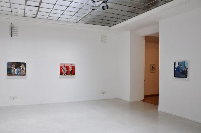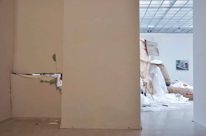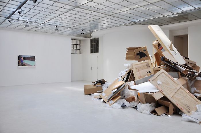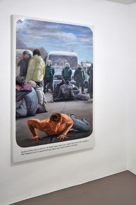 Bei den Zeichnungen gleichen die aus vorgefundenen Satzstücken und Schrifttypen collagierten Subtexte die größere Einheitlichkeit der farbfreien Darstellung aus, und fallen erst dort weg, wo das Dargestellte selbst emblemartig zur Aussage wird. Wenn im Zentrum der Ausstellung auf einer von Uniformierten umstellten, aus Galeriemüll hergestellten Barrikade eine Performance zum Tableau vivant erstarrt, in der ein Vanitas-text durch ein Megaphon geschrien wird, der unter anderem die Vermittler der eigenen Tätigkeit ins Dunkel schickt, wird ein weiteres mal eindringlich die Vergeblichkeit thematisiert, mit der Darstellungsebenen hin zu einer vermeintlichen, mehrdimensionalen Realität durchbrochen werden.