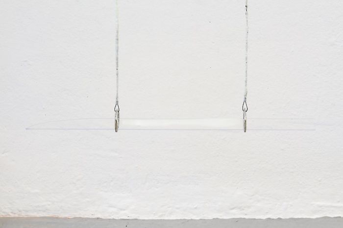 Barbara Hainz, Untitled, 2021, carpet beater pole, iron, steel cable, wax, gauze, plexiglass, swing, belt buckles 180 x 415 cm