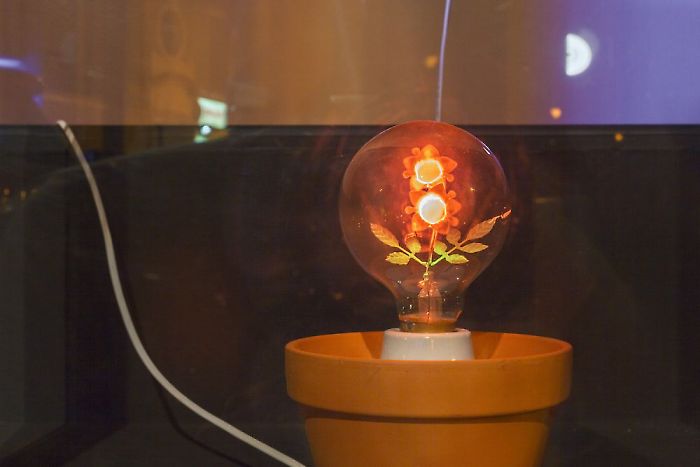 Excavating the obscure [2], rather kitschy early light sculptures of American minimalist Dan Flavin, neo-conceptual artist Lazar Lyutakov has produced a quasi-bootleg of those less known tabletop sculptures. Their obsolescent light bulb components are nearly identical to ones manufactured in Flavin’s era. After a period of archival research on the history of their production Lazar sourced and purchased the rare vintage light bulbs via the Internet. Inside of the clear glass is a perfectly crafted rose shaped filament emitting its incandescent light. As documented in the collection of MoMA, New York, the materials listed are: “Aerolux Flowerlite” light bulb, terracotta flowerpot, electric cord, and light switch. An artifact of its time, this novel item of amusement has long been out of production long before the standard incandescent bulb was recently phased out globally. The U.S. patent was filed on June 7th 1932, followed by a filing in Tokyo by another inventor on March 2nd 1936. Pursuing the same goal, each patent developed a different technology and design; one contains an incandescent light bulb with hand made glass objects inside with wires that heat up to provide light. The other utilizes a gas discharge to provide a similar mood effect. Formulating an idea for approaching the Flavin concept with difference, Lazar’s main objective was to create an alternative version. Much like a band that covers another bands song, stylistic distinctions are made in the content of the vessel. The vessel of contemporary art questions and determines what content actually is or isn’t when “user content” signify variations of the same mass appeal social construct. To use a fashion analogy, yesterdays dress “format” is the same as today, save for the switch to a “new” pantone color of the year. Critical mass jumps on the bandwagon; opinion as peer pressure is as easy as social media. Distinctions in content get watered-down, original ideas turn into “poor” iterations of sophisticated concepts and vice versa. Paradoxically there is richness in “poor”, well understood by the adage quantity not quality. Accountants can verify this statement!
