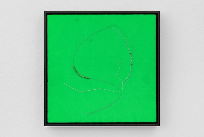 Glowing Pearls, threads and beads on fabric, 23,5 x 23,5 cm (framed), 2021
