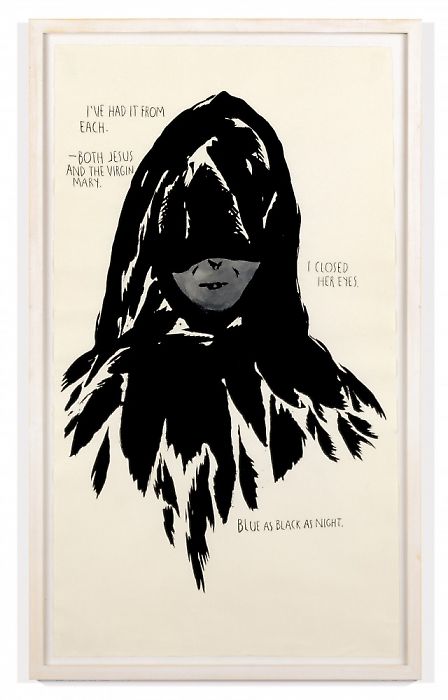Raymond Pettibon (born in 1957, lives and works in Long Beach, California) has been one of the most significant contemporary representatives of a conceptual approach to the medium of drawing since the 1980s. Originally active in California’s post-punk and hardcore scene, Pettibon began by designing self-published booklets, concert flyers, and record covers for bands like Black Flag or Minutemen. Initially known to a subcultural public, Pettibon’s work has long since found its way into renowned institutions around the world, from L.A.’s Museum of Contemporary Art to New York’s Museum of Modern Art. In his drawings, usually done in ink, he develops a visual language that exhibits a wide range of influences from American popular culture. He thus combines quotations and borrowings from comic strips, film noir reminiscences, art historical references, and associative seeming textual passages to complex assemblages of image and text. Using graphite, watercolor, or chalk, Pettibon combines his works done on paper or on the wall to form labyrinthine installations. The adjacency and superimposition of the most various individual images and texts, distributed across an entire wall, generates complex images that can be read both as a whole as well as split up into their individual elements. With an often oddly laconic drasticness, these ensembles of associations, references, and narrative allusions explore the dark and traumatic aspects, failed promises, and latently threatening myths of American politics and (sub)culture.