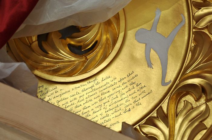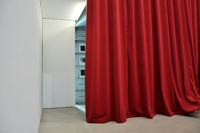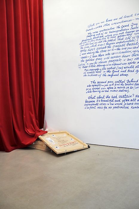 Ein erster Blick in die Ausstellung zeigt ein Ensemble von Werken, deren Präsentation eher an eine Inszenierung im Theater denken lässt. An der Hauptwand hängt ein schwerer, roter Vorhang von der Decke herab. Doch der Vorhang lässt sich nicht öffnen und verbirgt scheinbar Nichts. Er verdeckt lediglich eine hölzerne Box, die wie zufällig in der Ecke steht und halb geöffnet ist. Im Inneren befindet sich ein für den Künstler typisches, ikonenhaftes Objekt, dessen Details dem Betrachter verborgen bleiben. Die Installation wirkt geheimnisvoll und rätselhaft. Erst ein handgeschriebener Text an der Wand verrät mehr über die Werke des Künstlers, die eigens für die Ausstellung produziert worden sind.