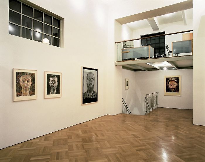 All of Close’s art presents an abundance of information in a dislocating scale that alters the terms of engagement between viewers and his art. Our role as viewers is to determine the relationship between the parts and the whole and to discern between the surfaces of his representational inventions—brush strokes, fingerprints, dots, dashes, pulp-paper particles—[...]. Close’s portraiture is not so much psychological as perceptual. Whether the surface of his images must be visually pierced, as in his early works, or pieced together, as in his most recent works, the recognition that the sitter is Phil or Keith gets us no further than the basic act of categorizing, of separating A from B. To understand these images, we must return to the artist’s notations, to the means he has used. His individual marks can be read as diaristic entries in his daily effort to express an image. Taken together, they create a portrait of Close’s sensibility, vision, and intellect that is more revealing than any of his self-portraits. [...]
