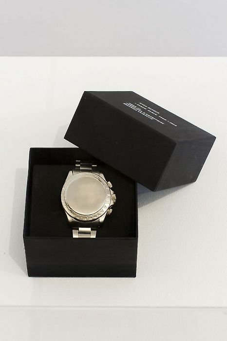 Ryan Gander, Clack, clack, thud, 2013, A bracelet made as a solid steel carbon copy of the artists watch, which also happens to be a work of art entitled 'Time is money my friend’, 85 x 60 x 85 mm, photo: Peter Paulhart