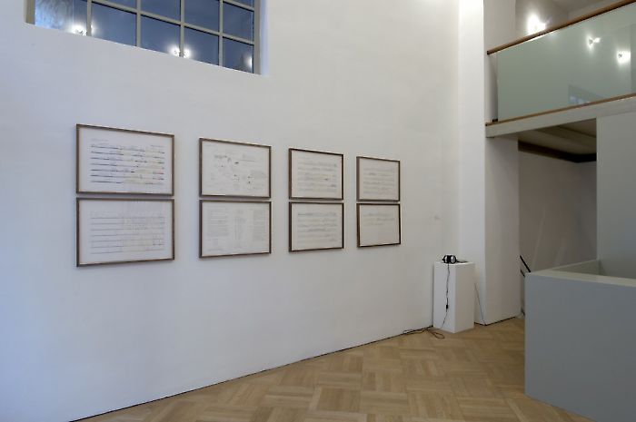 Curating an exhibition on the subject of music and fine art represents a challenge in several ways. Against the backdrop of the avant-garde currents of the early twentieth century, with its discourse in manifestos and theoretical writings on the dissolution of the genre boundaries between music, theater, film, and the fine arts, there is the danger of becoming formalistic or dogmatic, of succumbing to a renewed establishment of hierarchic relations between the discursive and the visual. During the later half of the twentieth century, John Cage became the key mediating figure between the fine arts and music, after shattering the term “music” and opened it to neighboring disciplines. His principle of “calculated chance” and the call to “do it yourself” pursued in the Fluxus movement led to an expansion and almost insoluble mixing of realms. Bernhard Leitner, originally from the realm of architecture, understands sounds as a construction material, exploring in his experiments the impact of sound architecture on the body of the spectator. He draws new borders in our structure of perception, by organizing the space into zones where certain tones are heard and felt and in zones that are found beyond what is heard.