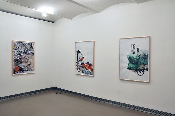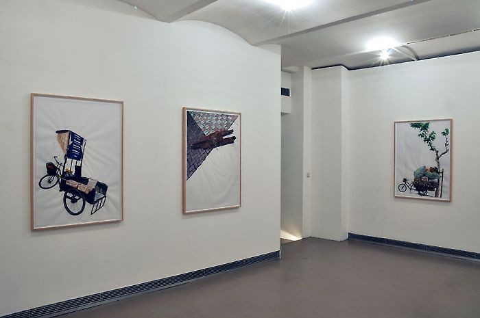 Ina Weber’s decisive observations can also be seen in the new series Müllsammler Shanghai. These watercolors emerged as part of a group show that was on view in the Chinese port. The curious organization of garbage collectors who belong to everyday life appealed to the artist, for one because it brings questions of recycling and sustainability to the forefront. At the same time, knowing that Ina Weber is a passionate bike rider and recalling her dedication to collecting, it quickly becomes clear that she was perhaps not just looking for differences, but also for commonalities. With great deliberateness and in her typical fashion, she animates what are essentially drawings that are free of human presence. A sense of immediacy overcomes the beholder. The works show us an individual collecting his rubbish and placing it on the scales to eek out a living.
