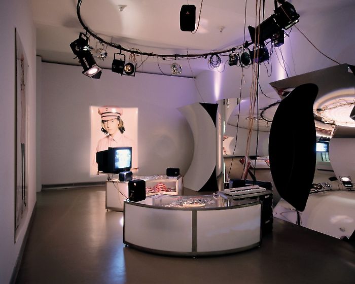 Scher’s costuming of the children in the photos in identical pink uniform suggests that children are imprisoned in manufactured adult notions of “innocence” and childhood identity. The actual hats and shirts that were worn by the children lie neatly folded and abandoned near the computers that form a circular lagoon in the middle of the room. It’s as if the enforced identity has been discarded at the edge of the information pool, the way children once would have abandoned their clothing when taking a dip in the local swimming hole.