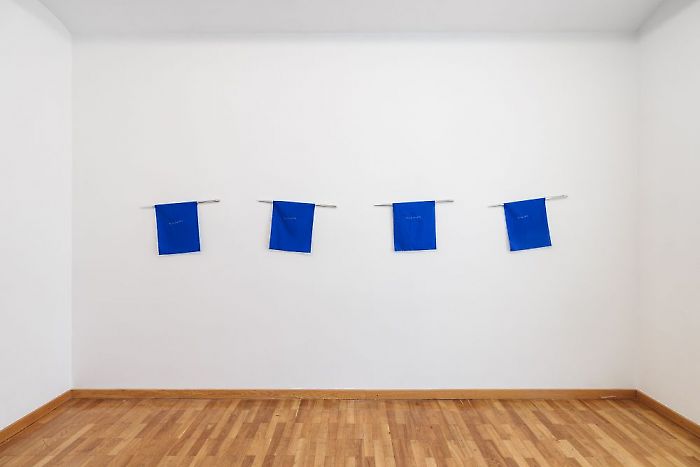 Textile, a material often more reminiscent of women’s craft than an artistic medium – associated with virtuous industriousness and historically used to constrain women’s imaginations and ambitions – has gained recognition from the art world over the past decade. In “A Survey on the Significance of Textiles in Contemporary Thought and Praxis,” published in 2014, Rike Frank and Sabeth Buchmann note that textiles have been the focus of many research projects and major exhibitions in the years leading up to the publication of their article.[1] Ten years later, exhibitions dedicated to the use of textiles as an artistic medium in (contemporary) art, offering insights into regional forms of expression, experience and social practice, mainly by women artists, are still increasingly present. “I start somewhere and it expands instinctively from there,” says Daschner of a certain sense of freedom she finds in embroidery, which has been a constant presence in her work since the very beginning of her artistic career in the mid 90s, also as an additional, abstract way of imagining her filmic works (the so-called “embroidered storyboards”).[2] The needle is her tool, the “handiest pen to write down my inner thoughts” – with it, through the rhythmic, intimate acts of stitching, she reclaims space and her own narrative, which expands and grows. Hanging on the walls, on view are filigrane embroidery works on blue and green screen fabric, reminiscing her filmic practice, which combine coloured threads with tiny, shiny beads (Water Beings (blue series), 2024); embroideries joint with golden brass needle objects, 100 x 100 cm in size (Heavy Needles, 2024); and golden brass needle objects, 70 cm in size, with crochets (Silver/Golden Eggs on Golden Needle, 2014/2024). Very personal to Daschner in the exhibition is the embroidered series, My Body, 2024. Here, her embroidered handwriting reads: “My body on the tree / My body fragmenting / My body breathing / My body untangling / My body unfolds.”