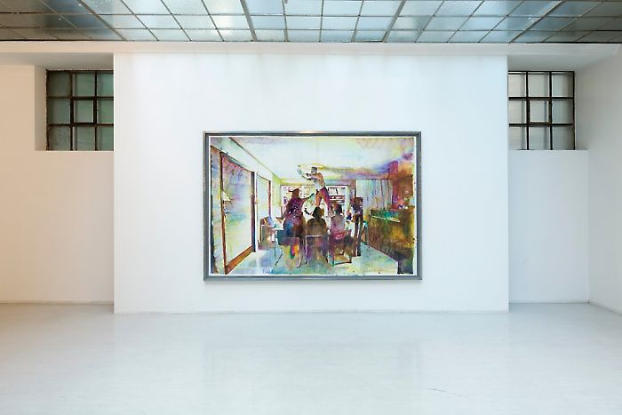 By transforming his motifs to large format paintings, Martin Dammann focuses on emotions that he discovers in a photograph and applies them with intense hues in his watercolors. In general, the objects in the images are alienated by the choice of the watercolor technique, and only certain components of the image become recognizable. The blurred character of the watercolors can allow for less clarity, both in the process of painting and in their interpretation. Sometimes he leaves out faces or entire bodies that either remain white or are transformed into unicolor surfaces. It seems almost as if his paintings emblematize the human, fragmented form of memory. Elements of what we experience do not even reach our memory, while others can only be summoned as blurry images, and some things remain very precise and clear. In its entirety, it is as incidental as the process that takes place when painting with watercolors on paper.