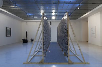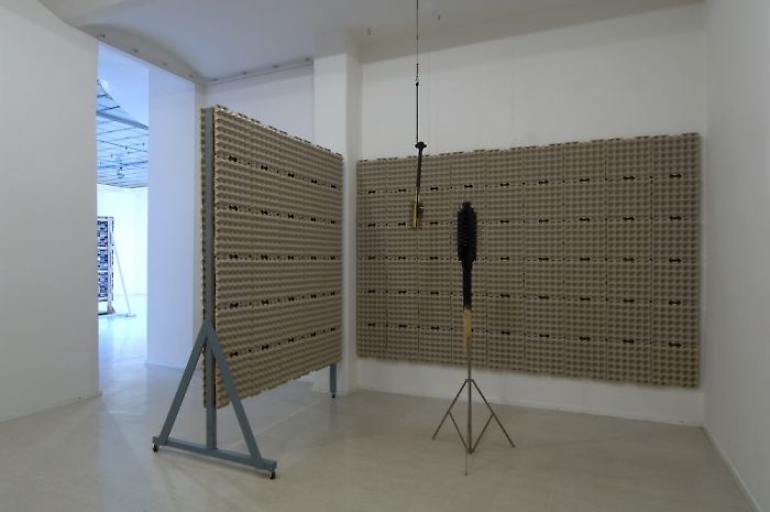 In so doing, the trained sculptor Michael Gumhold proves to be an astutely ironic specialist of sampling. His rough material aesthetic and expressive gesture are directly borrowed from the event-like characters of music, especially from hard rock. In his Rehearsal : Room installations, familiar apparatuses from the realm of music, such as instruments, microphones, or amplifiers are taken from their original functional context and find their existence as sculptures in the sign system of art—a drum made of an empty oil can and wood boards, sound proofing walls made of egg cartons, or reconstructions of microphones studded with nails. The music itself remains silent, but its revolutionary potential, its affective immediacy and performative power are brought to the exhibition situation.