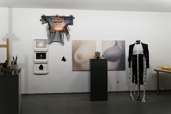 As varied as the subjects of Nedko Solakov’s little narratives are, the media of his artworks is also used to materialise them. While in his early art career he mainly created paintings (already incorporating various materials onto the canvases back then), the current show presents works that range from drawings in a customised frame with the story written on it to murals (Inside/Outside), and from wall installations [Five Paintings (The Formalistic One, The Quarantine One, The Imprimatura One, The Rookie One and The Handmade One)] to freestanding sculptures presented in the middle of the room. For these objects he uses aluminium casts, an assemblage from a Socialist time (The Old Object) or specially sewn or altered tissue or garment (like for A