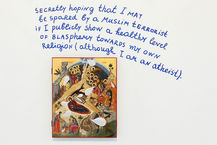 Nedko Solakov, An Attempt at Possible Prevention, 2016, black drawing ink, white stickers over a found Nativity icon, 60 x 50 x 4,5 cm; handwritten text (or vinyl, based on the original handwriting); overall dimensions 102 x 114 x 4,5 cm, photo: Peter Paulhart, Courtesy Georg Kargl Fine Arts, Vienna