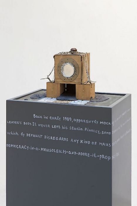 Nedko Solakov, The Old Object, 1989 - 2016, an old object produced in 1989, acrylic, bronze, various wires, brass nails, screws, staples, a zip part, a drawer handle, a cap from an Earl Grey tea container, three floor covering samples, graphite, silverish powder on wood and plywood, 22 x 41 x 27 cm; a pedestal produced in 2016, paint on MDF, text, 110 x 45 x 31 cm; overall dimensions 130 x 45 x 31 cm, photo: Peter Paulhart, Courtesy Georg Kargl Fine Arts, Vienna