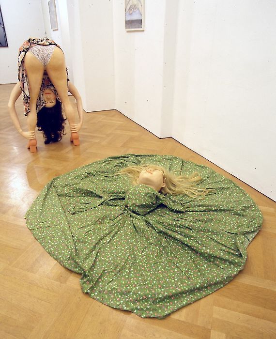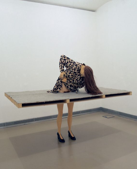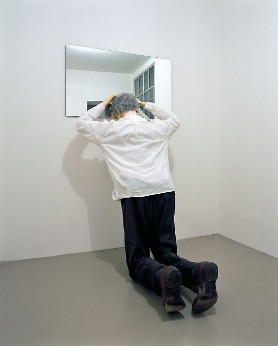 Recognizing one’s own physical appearance in the mirror in early childhood––according to structuralist psychology––gives rise to an imaginary self-image, it arouses a desire for an ideal totality and intactness of the ego that develops in the very moment one sees one’s own body in the mirror. Paul de Reus’ figures address the ideal image of desire, also central to the myth of Narcissus, for a complete identification of the ego with oneself and at the same time reflect that desire by means of alienating elements. It is not merely that his ensembles that work with reflections do not provide a realistic image of his figures––they also reveal the imaginary structure of the human self-image, and question this. His sculptures often have monstrous proportions entire parts of the body are missing, some consists only of fragments, others are caught in unnatural, grotesque situations and positions. The sometimes alarming realistic effects are caused, on the one hand, by the fact that the sculptures are life-sized and on the other hand by the use of various natural looking materials like hair or textiles and their coloring. […] Paul de Reus’ works do not have a reproducing function. They are neither portraits, nor dolls, nor robots, nor machines; they are creations that radiate their own individuality and suggest the intensity of their creator’s analysis of himself, his surroundings, his thoughts and his fantasies.