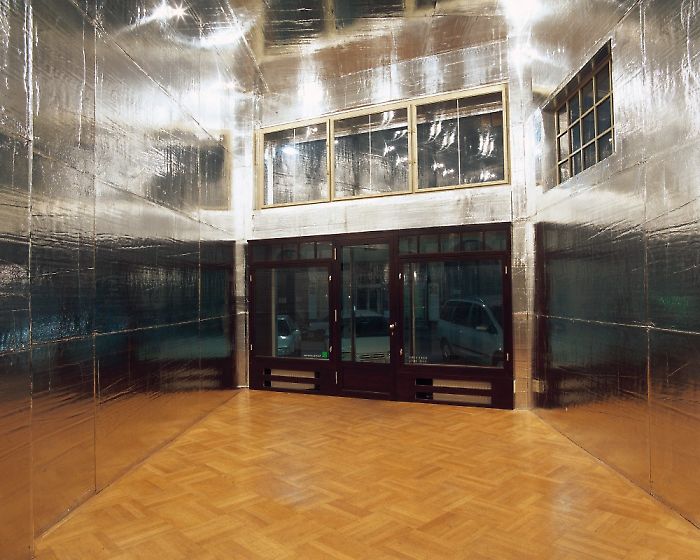 To talk about the new installation by Rudolf Stingel, one must first describe the unique architectural characteristics of the gallery where it was installed: not the standard white cube, but a series of connecting rooms and corridors on three levels. Stingel covered every surface of the front galleries, offices, and the hallways with a shiny aluminium foil called Celotex Tuff-R, which is used as an insulation material for home construction. The artist successfully used the material to mute the features of the architecture, diffusing the surfaces and textures of the existing structure so that they fused into a mirror that expanded and distorted the given space. The reflective tone of the rooms dematerialized the gallery, making it feel like a constructed labyrinth. Stingel’s allover approach advanced a familiar minimalist strategy: By equalizing all surfaces through the simplification and elimination of details, he provoked a pure, cleaned-out encounter.