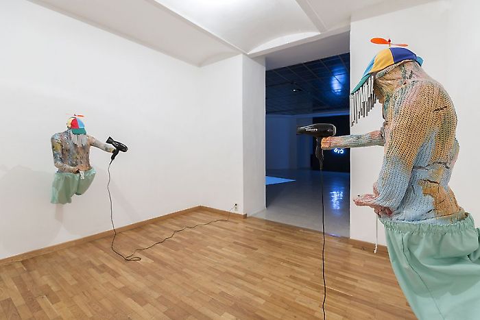 Kris Lemsalu, I will be seven when we meet in Heaven, 2016, ceramics, metal, textile, hair dryers