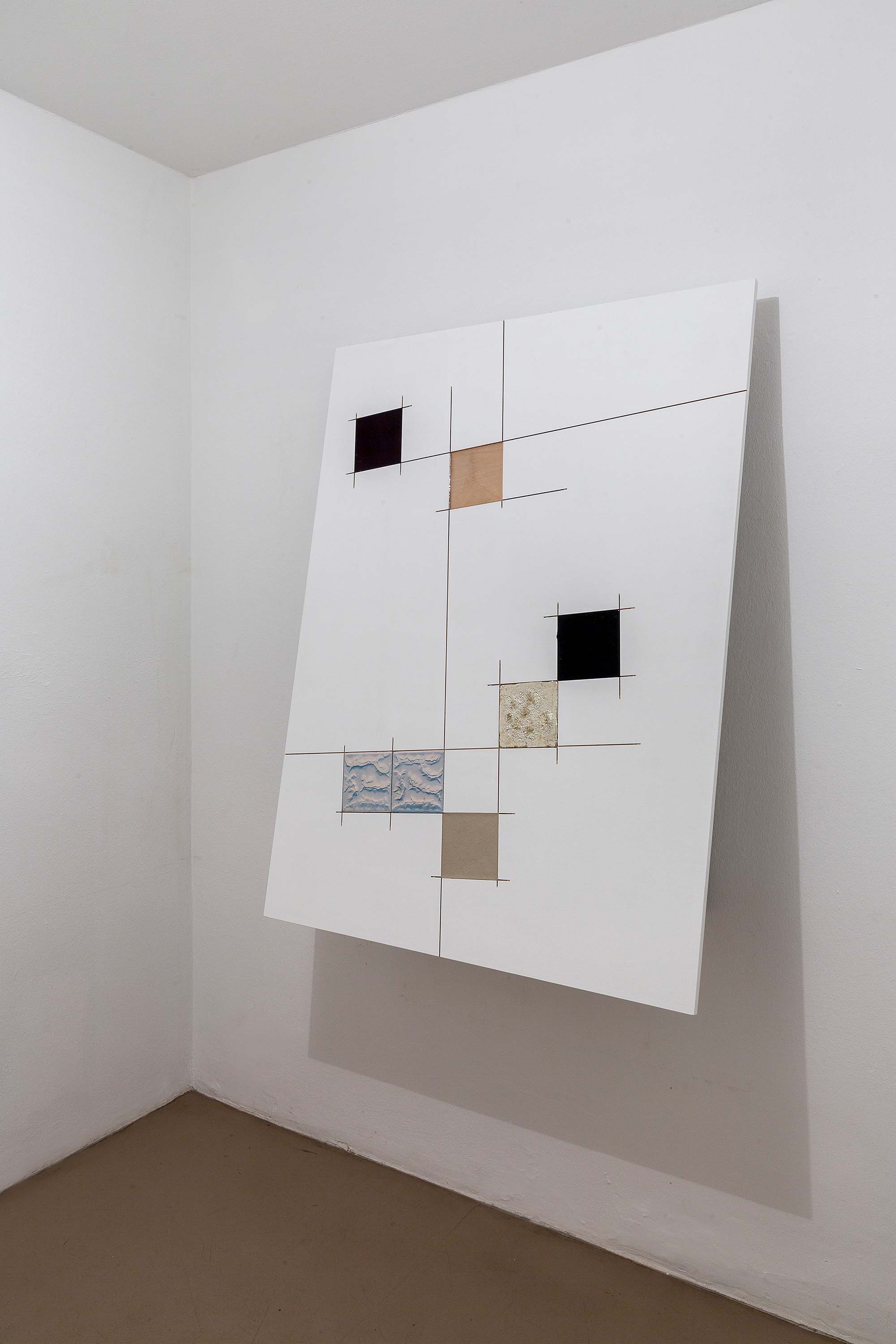 Andreas Fogarasi, Study Desk (Two tiles from a specific place, three specific and two unspecific samples), 2017, plywood, wall paint, steel consoles, ceramic tiles, tile cement, candle wax, tin, sealing wax, resin, 135 x 100 x 32,5 cm, Foto: Matthias Bildstein, Courtesy Georg Kargl Fine Arts, Vienna |